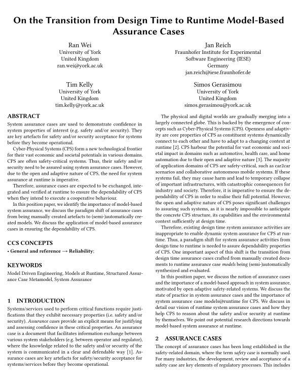System assurance cases are used to demonstrate confidence in system properties of interest (e.g. safety and/or security). They are key artefacts for safety and/or security acceptance for systems before they become operational. Cyber-Physical Systems (CPS) form a new technological frontier for their vast economic and societal potentials in various domains. CPS are often safety-critical systems. Thus, their safety and/or security need to be assured using system assurance cases. However, due to the open and adaptive nature of CPS, the need for system assurance at runtime is imperative. Therefore, assurance cases are expected to be exchanged, integrated and verified at runtime to ensure the dependability of CPS when they intend to execute a cooperative behaviour. In this position paper, we identify the importance of model-based system assurance, we discuss the paradigm shift of assurance cases from being manually created artefacts to (semi-)automatically created models. We discuss the application of model-based assurance cases in ensuring the dependability of CPS.